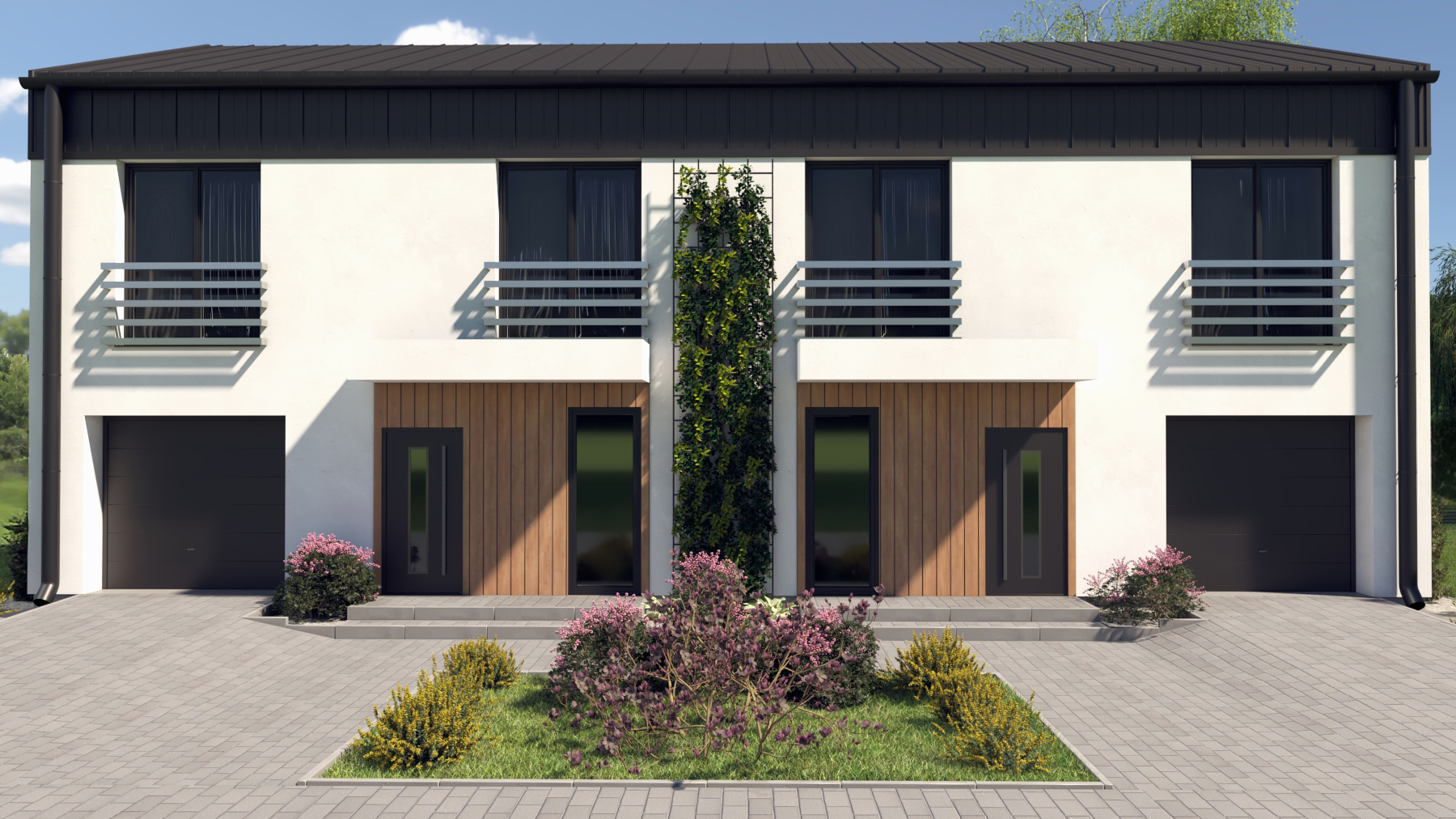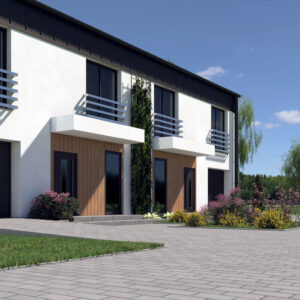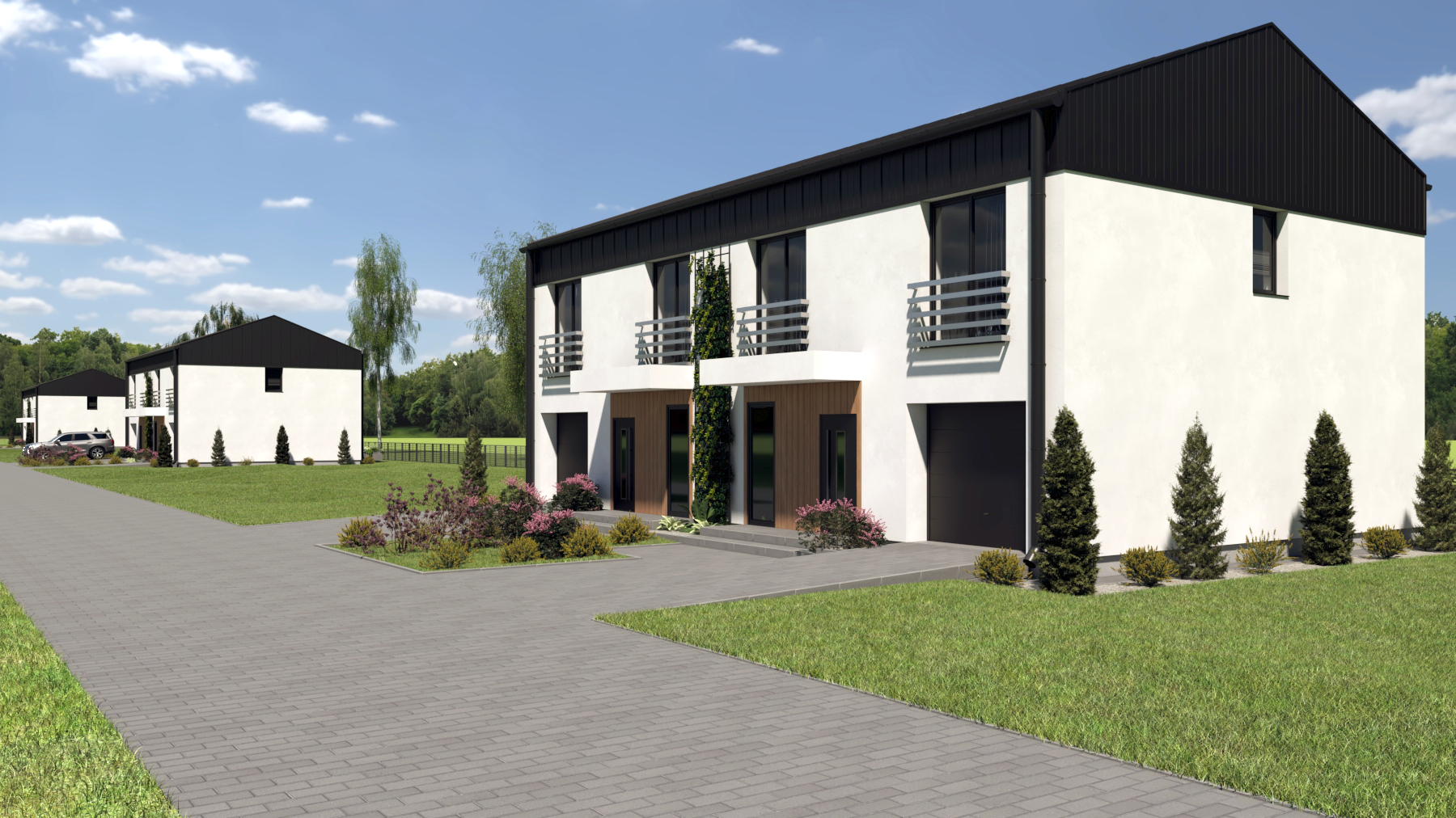 Ściany budynków będą murowane, dach wykonany z drewna i pokryty nowoczesną, płaską blachą. Dwuspadowy dach o kącie nachylenia 30° nadaje bryle elegancki i klasyczny wygląd, doskonale wpisując się w spokojny, podmiejski charakter okolicy.
