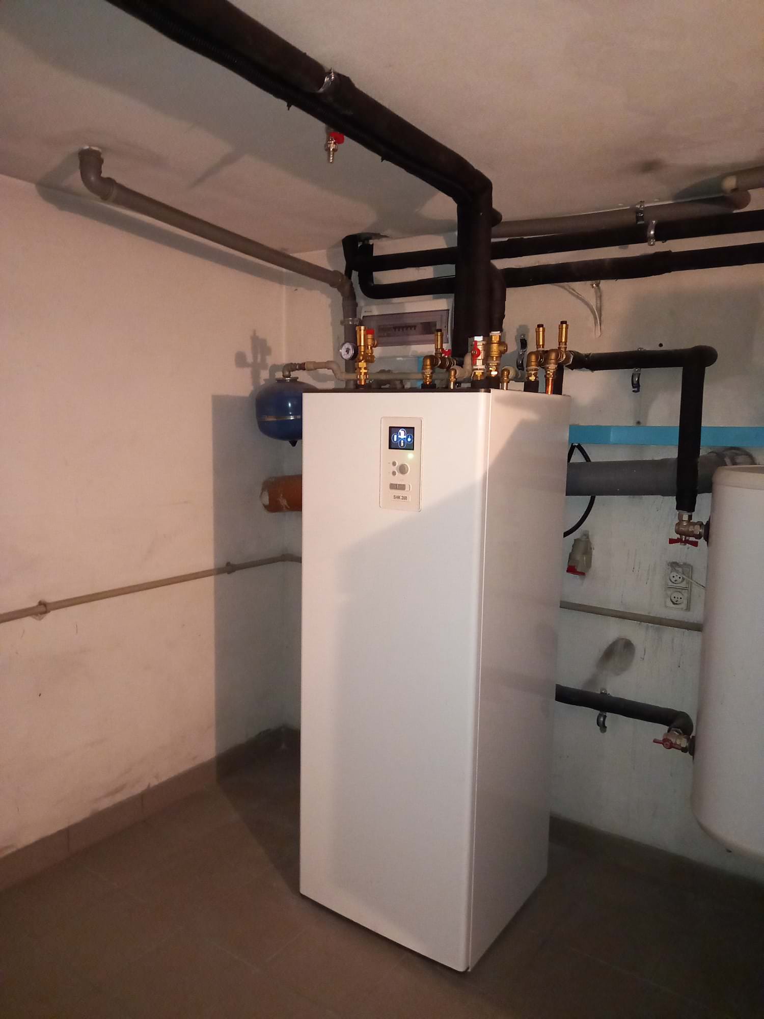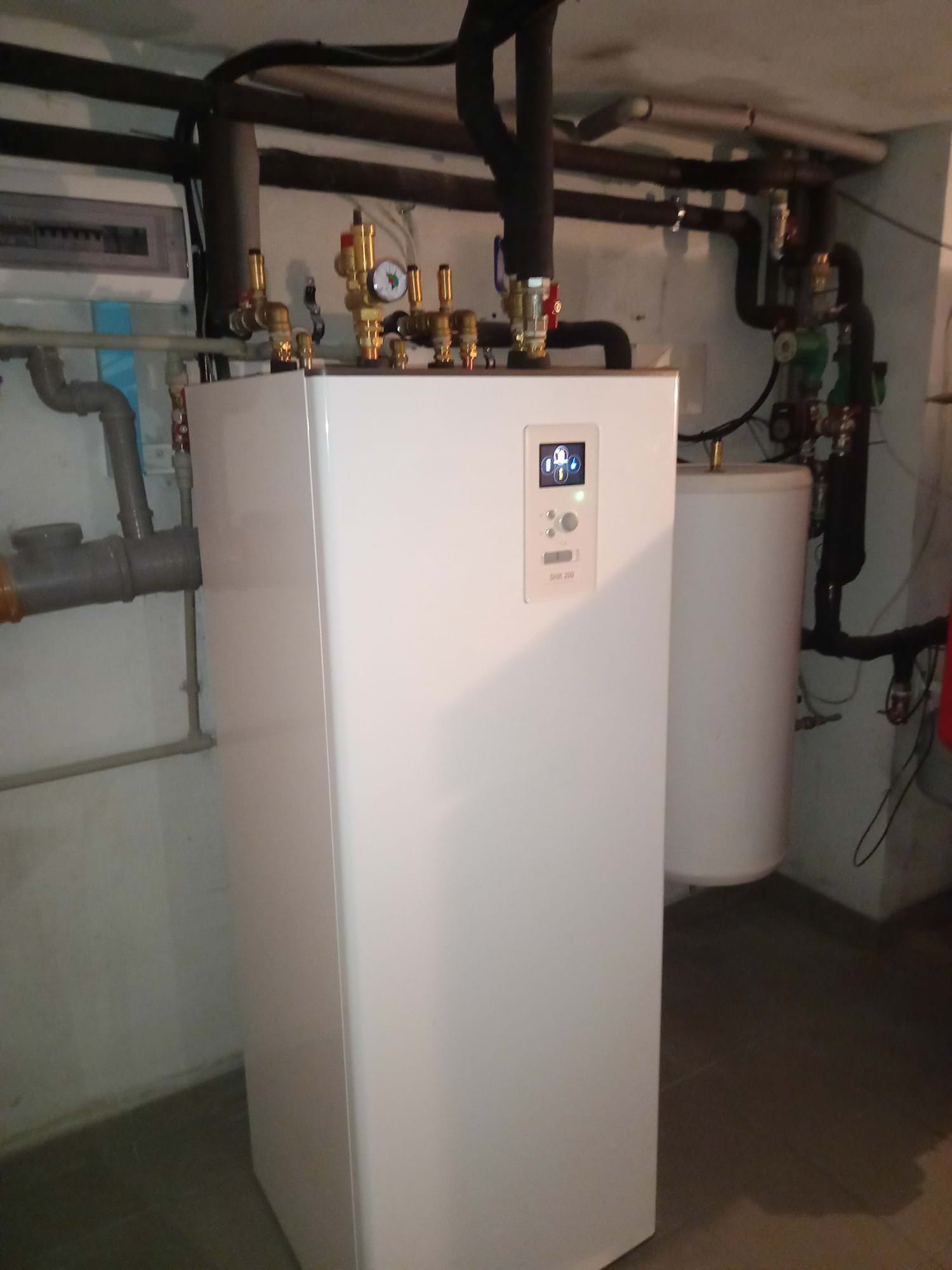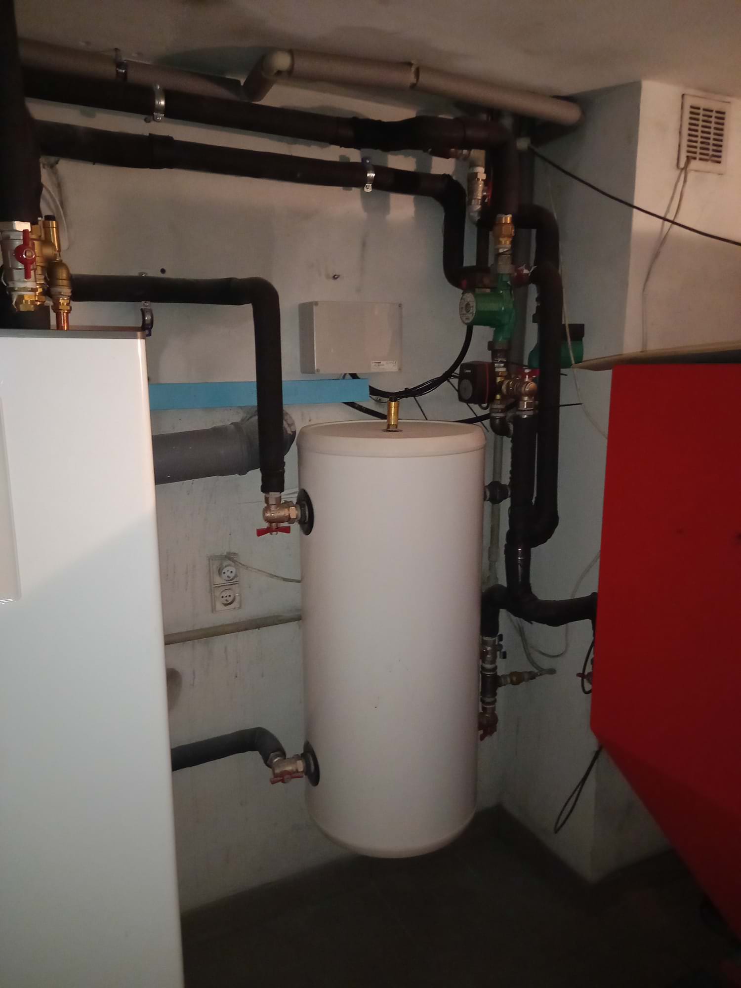 W tej realizacji zamontowano powietrzną pompę ciepła typu monoblock Nibe F2120-12 o mocy grzewczej 9,8 kW. W systemie zastosowano bufor o pojemności 100 litrów, który rozprowadza ciepło zarówno na grzejniki, jak i na ogrzewanie podłogowe. Dodatkowo zainstalowano wieżę hydrauliczną SHK 200, która zapewnia pełen komfort użytkowania dzięki zintegrowaniu zasobnika ciepłej wody użytkowej (CWU), sterowania grzałką oraz zaworu trójdrogowego w jednym urządzeniu. W ramach modernizacji systemu zdemontowano stary piec na ekogroszek. Warto dodać, że u tego klienta wcześniej została zamontowana instalacja fotowoltaiczna, co dodatkowo zwiększa efektywność energetyczną całego systemu.